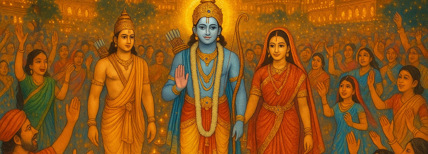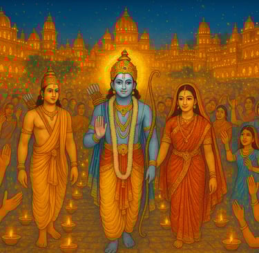 The return of Lord Rama to Ayodhya after defeating Ravana, symbolizing victory of righteousness and upholding dharma.
