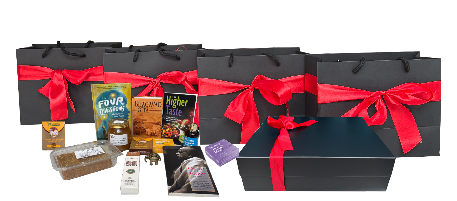 Bhagavad Gita, wisdom books, hand curated set of cow byproduct based toiletries and incense packs are specially selected to give you a herbal treat that's not only good for the skin but also soothes the mind and surcharge a place with spiritual energy. Your purchase of the cow byproduct items will also help support upkeep and care of cows and bulls in their old age, giving them a safe, loving home.