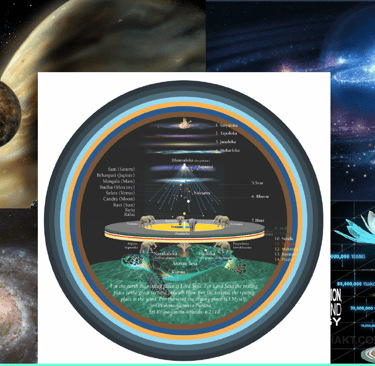 This book series presents a profound view of the universe, deeply rooted in Vedic cosmology. It describes the cosmos as a creation of the Supreme Being, where material and spiritual realities coexist. The universe is depicted as a vast, multi-layered structure known as the "Brahmāṇḍa" or cosmic egg, containing numerous planetary systems.